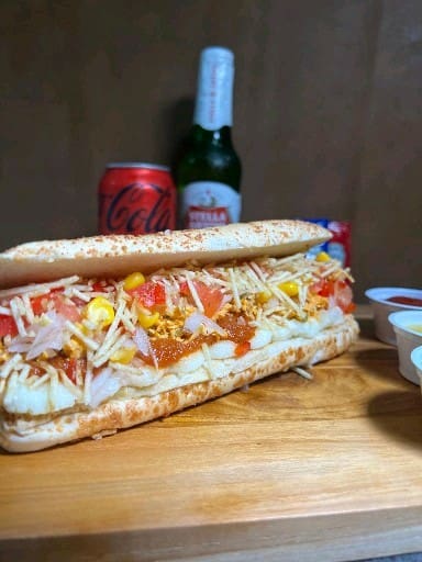 Pão baguete com parmesão de 23cm, salsicha Seara, purê de batata com parmesão, frango cremoso desfiado, vinagrete(tomate, cebola e pimentão), milho, molho Bezoos, maionese Bezoos, ketchup, mostarda e batata palha crocante, prensado na chapa.